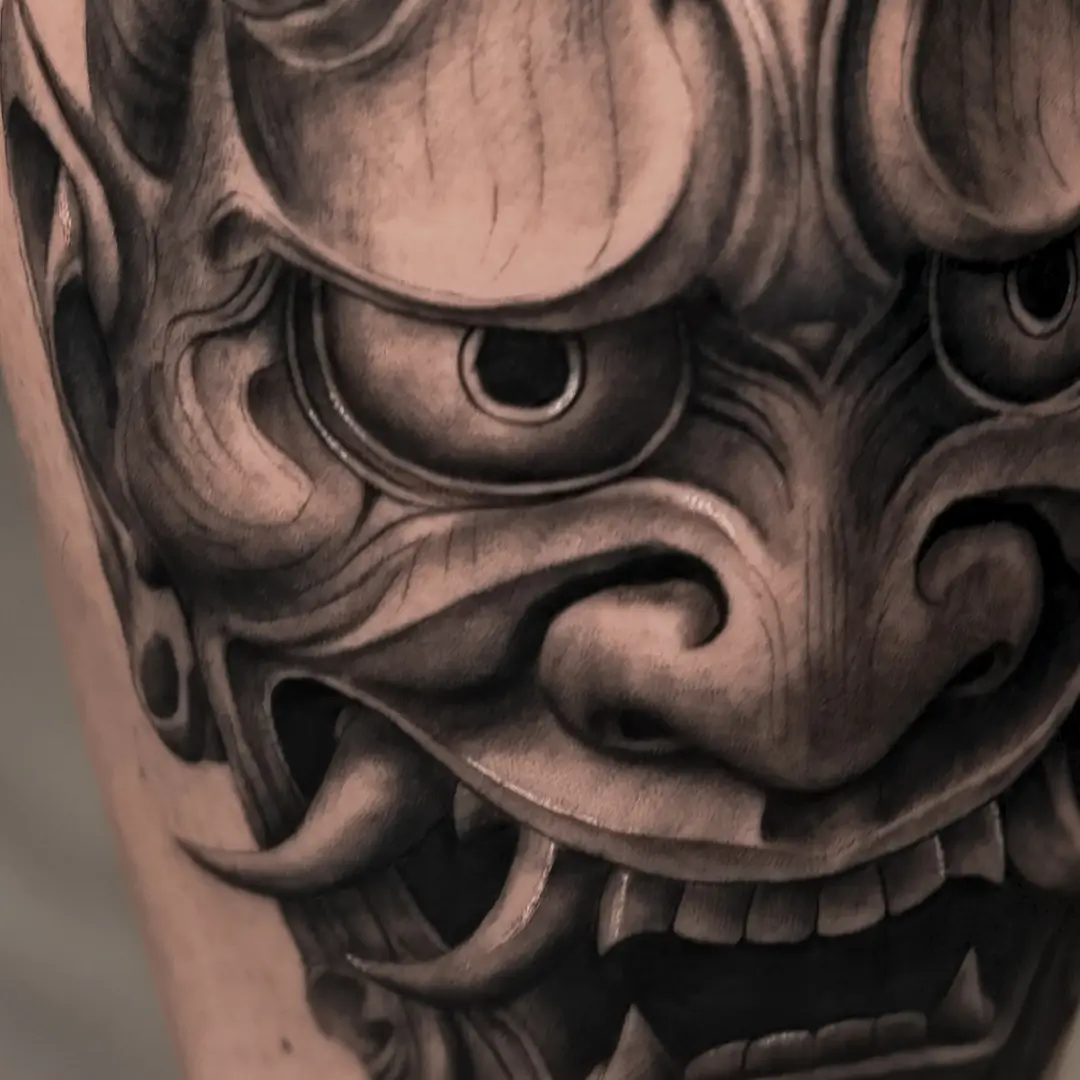 dark realism hannya mask tattoo by oleg.r.tattoo Calgary